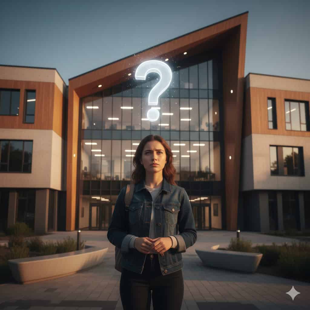 Person standing before modern building entrance.
